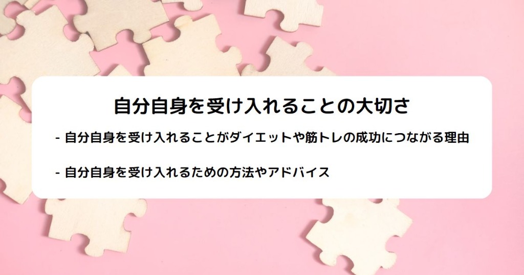 自分自身を受け入れることは、健康的なダイエットや筋トレの成功につながる重要な要素である。自分自身を受け入れることは、自分自身に対するポジティブな態度を持つことを意味し、自分自身を愛し、尊重し、自分自身に対して優しく接することができるようになる。これにより、自分自身に対するネガティブな感情やストレスを減らすことができ、健康的な生活習慣を維持することが容易になる。